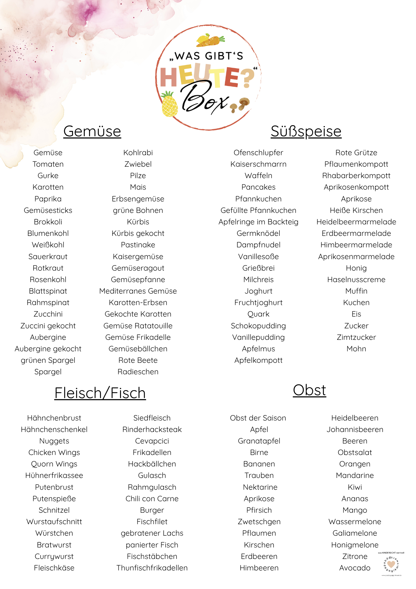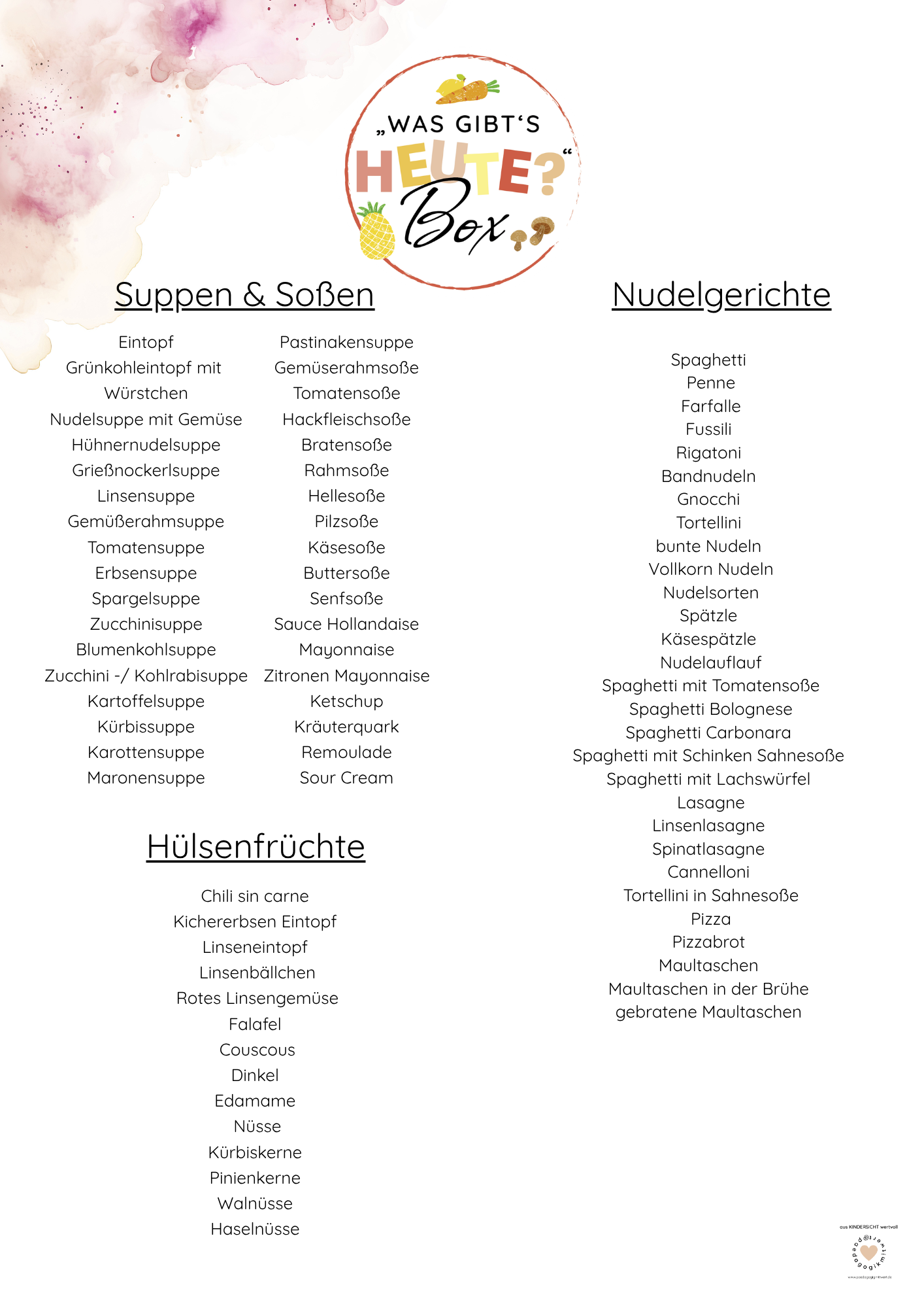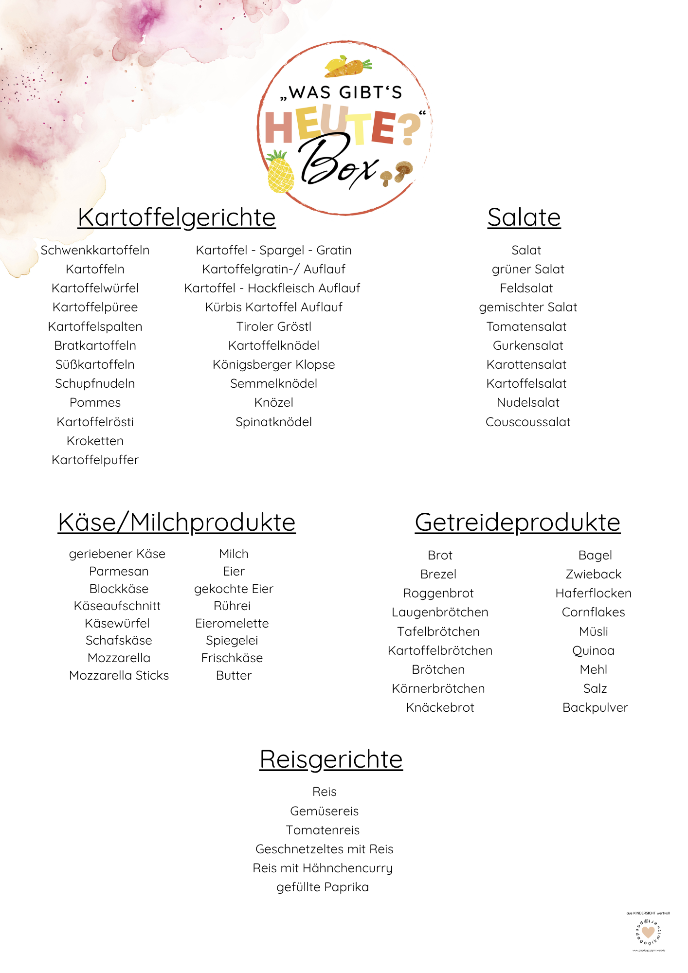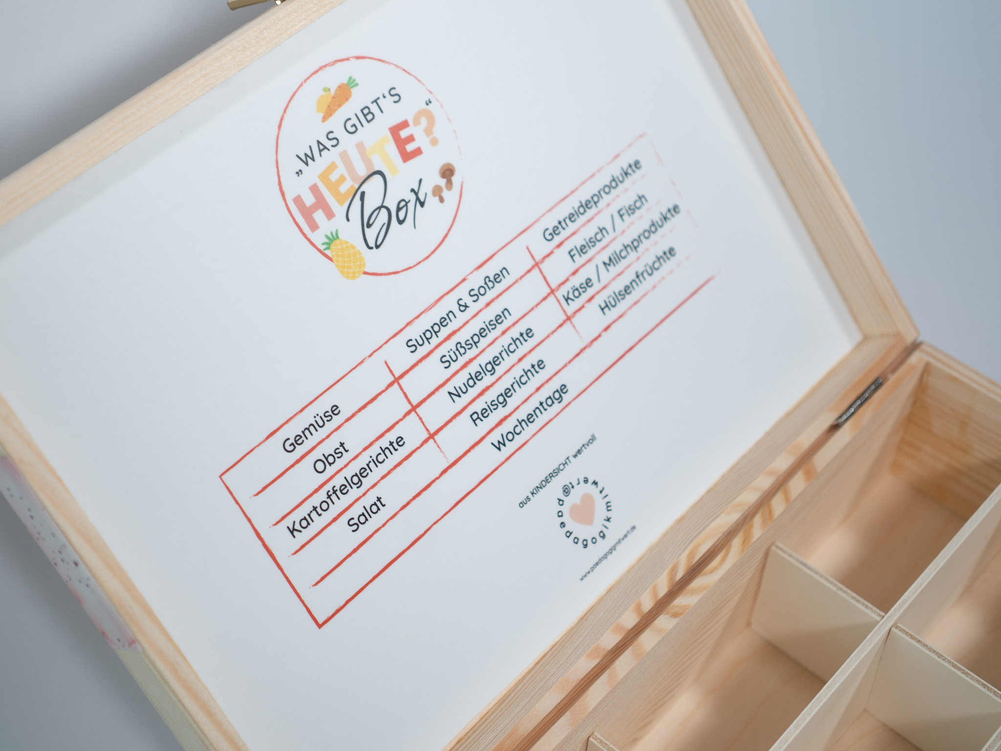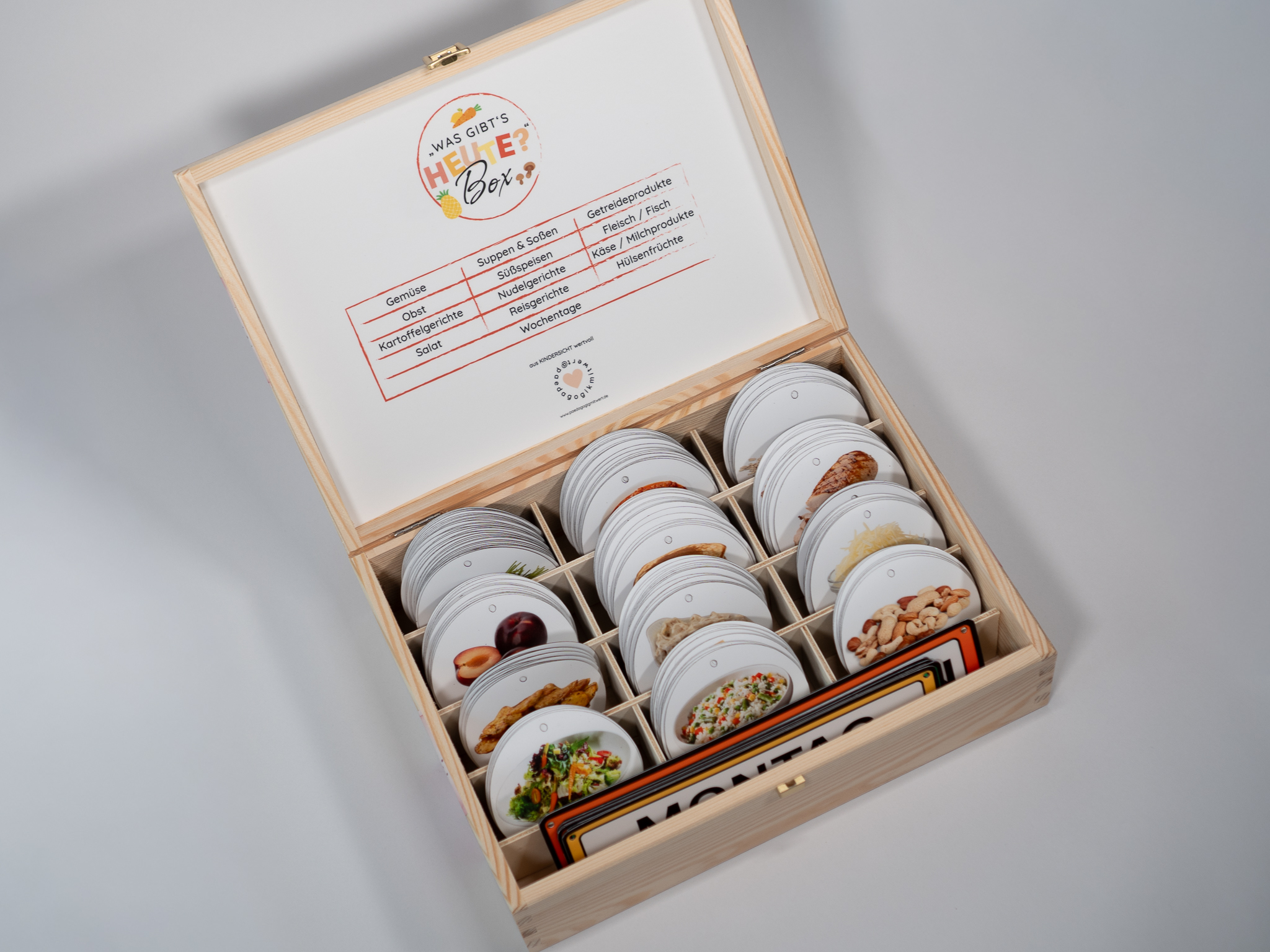 Die „Was gibt’s heute?“-Box ist die ideale Begleitung, um Mahlzeiten im Alltag sichtbar, verständlich und klar zu gestalten.